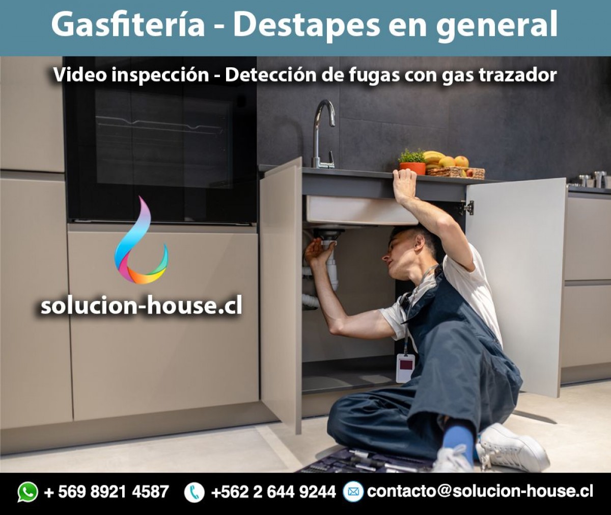 Ofrecemos el servicio de gasfitería en general, instalaciones sanitarias, detección de filtraciones de agua con equipos de ultra sonido, gas trazador, termo grafía, reparación de filtraciones de agua en todos los materiales y medidas, destapes en general, alcantarillados, artefactos, piletas, colectores, verticales y horizontales de edificios, tenemos el servicio de ductoscopia (video inspección). Reparación y mantención de sistemas de calefacción, calderas.
