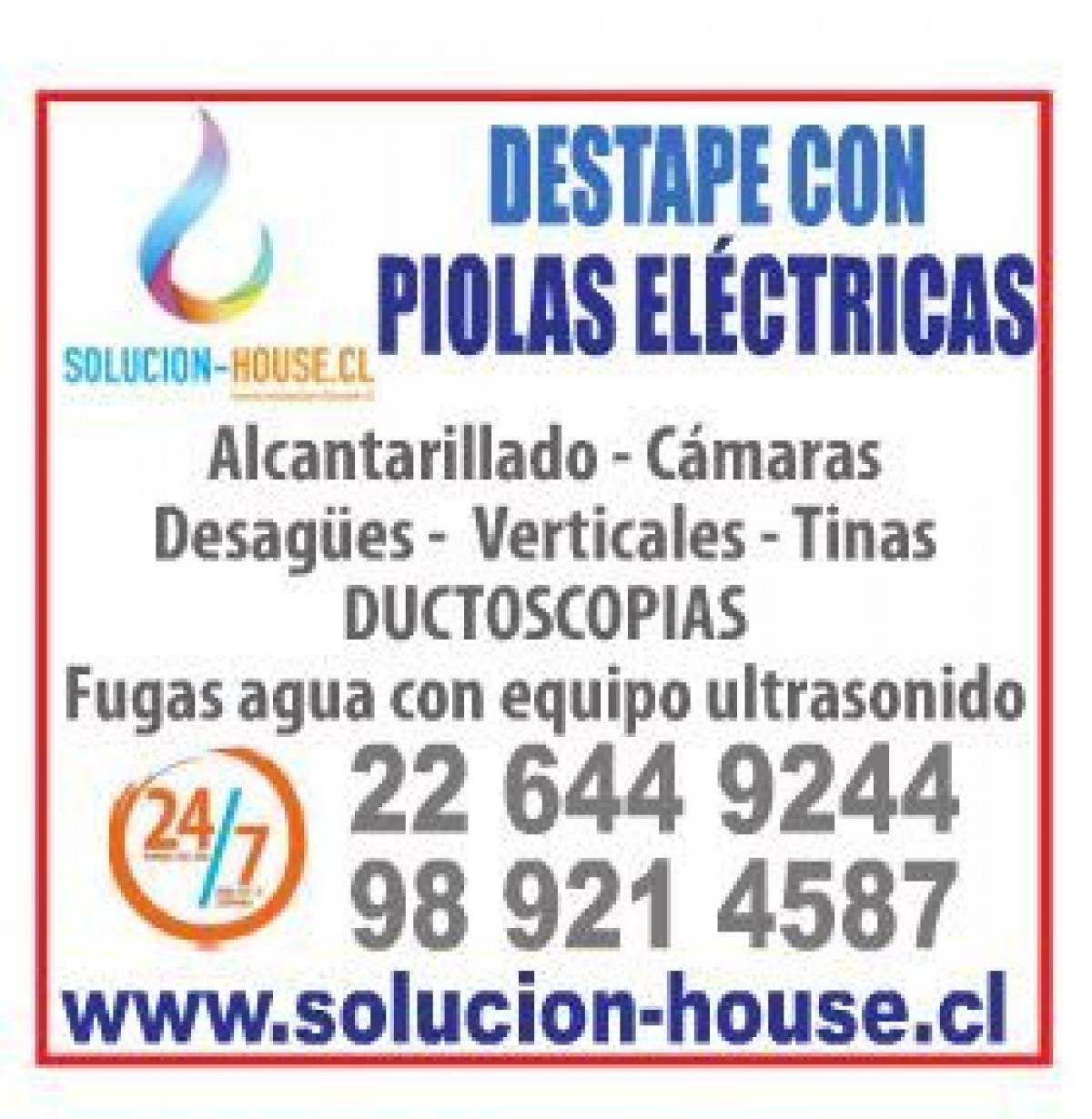Ofrecemos el servicio de destape de alcantarillados, artefactos, tinas, piletas, lavamanos, lavaplatos, WC, destape de verticales y horizontales de edificios, gasfiteria en general, instalaciones sanitarias, detección de filtraciones de agua con maquina ultra sonido, gas trazador, termo gráfica, reparación de filtraciones en todas las medidas y materiales, servicio de ductoscopia.